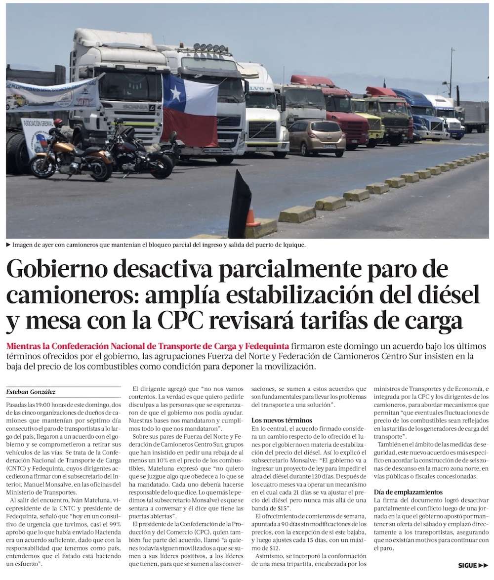 Camioneros se dividen tras oferta de Gobierno de congelar precio de combustibles por cuatro meses - (El Mercurio de Santiago)