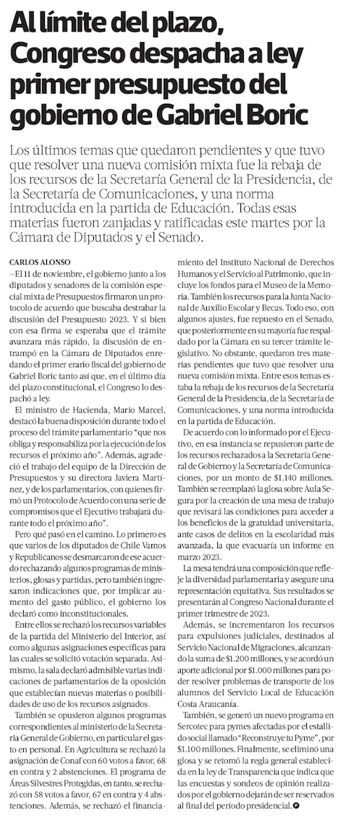 Despachan Presupuesto con fondos adicionales para Migraciones y pymes - (El Mercurio de Santiago)