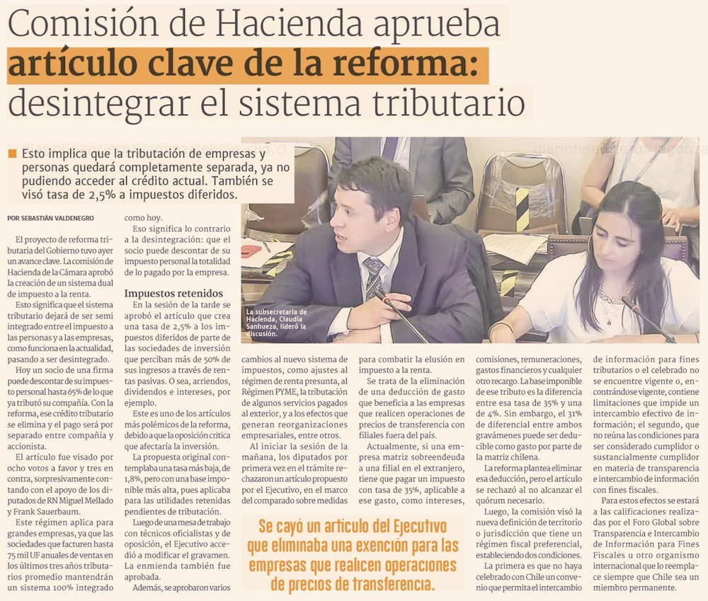 Aprueban desintegración del sistema tributario y tasa de 2,5% al diferimiento de impuestos - (El Mercurio de Santiago)