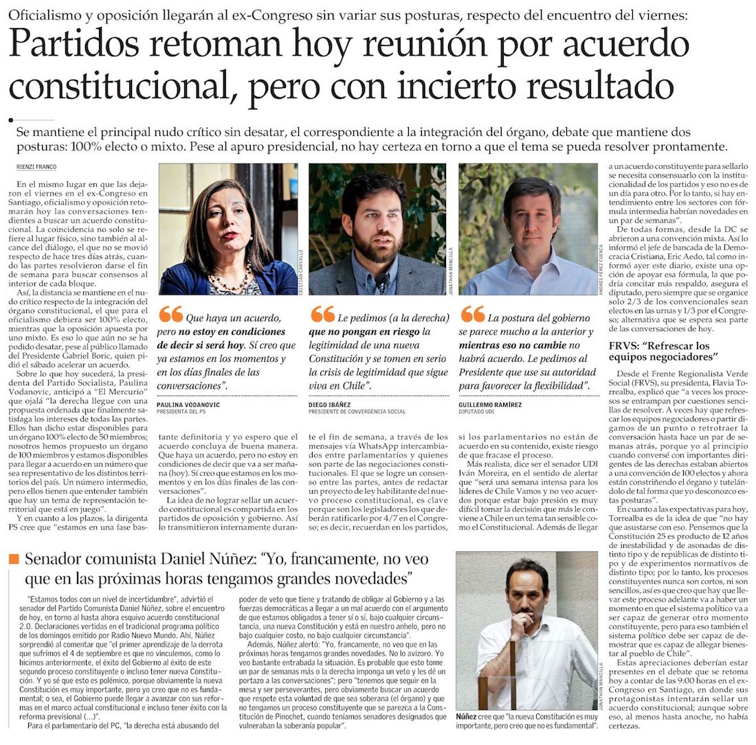 Gobierno apura cierre de acuerdo constitucional mientras partidos buscan destrabar nudo crítico - (El Mercurio de Santiago)