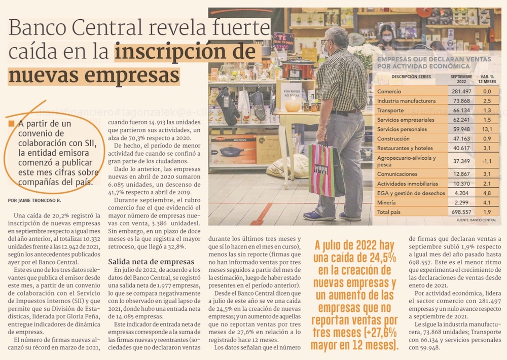 Banco Central lanzan nuevo indicador de creación de empresas: en septiembre se establecieron más de 10 mil firmas y una de cada tres es el sector comercio - (La Tercera)