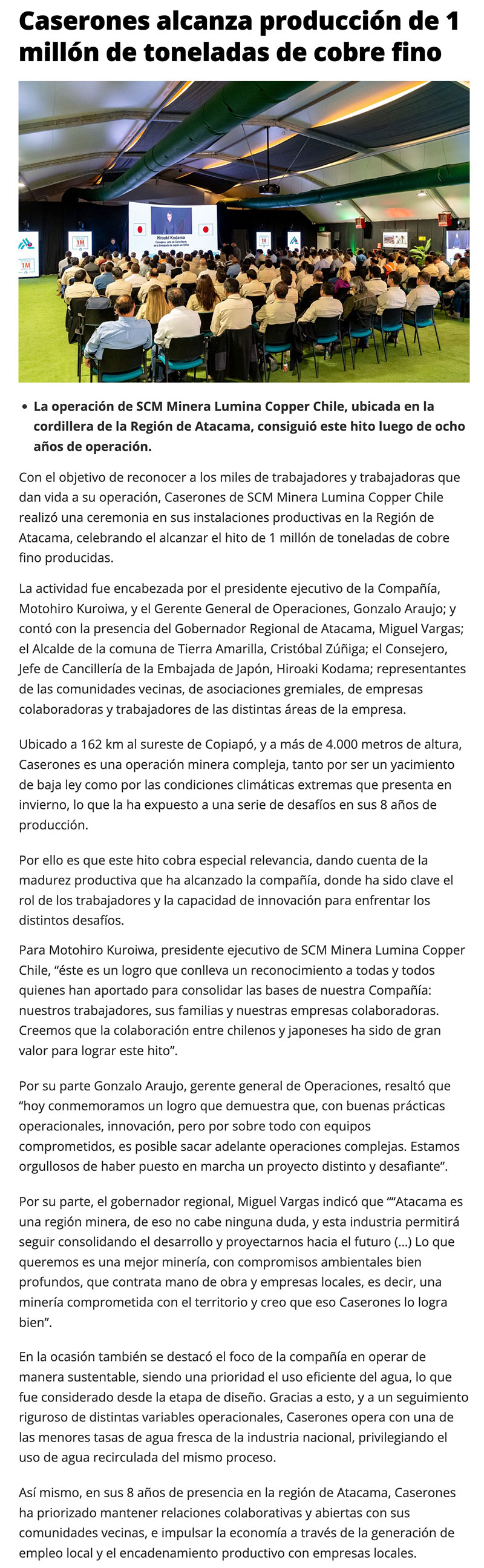 Minera Caserones llega a un millón de toneladas de cobre fino producidas - (El Mercurio de Santiago)