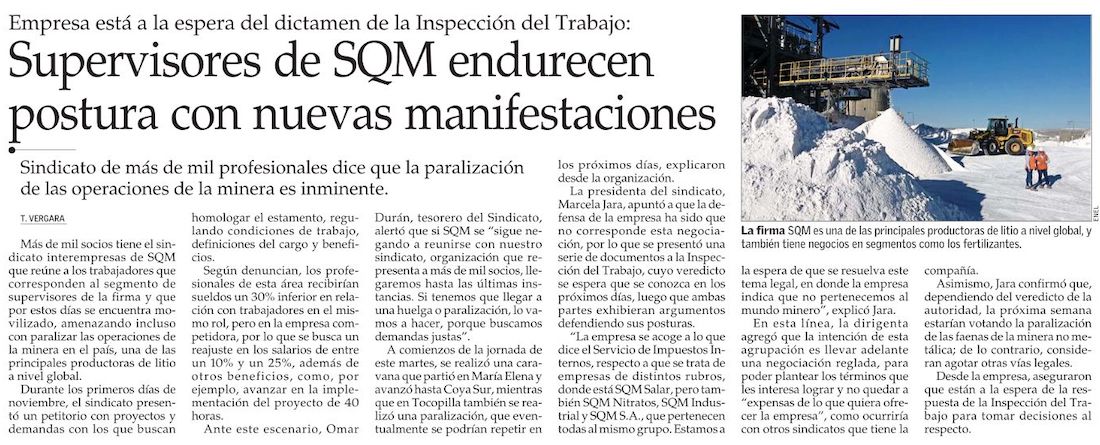 Supervisores de SQM se movilizan ante la negativa de la empresa a una negociación - (El Mercurio de Calama)