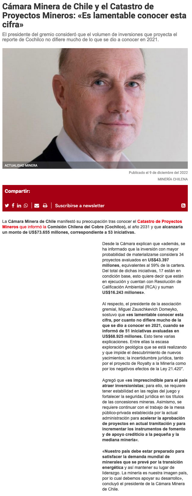 La Cámara Minera de Chile lamentó la baja inversión que se viene para el sector - (Las Últimas Noticias)