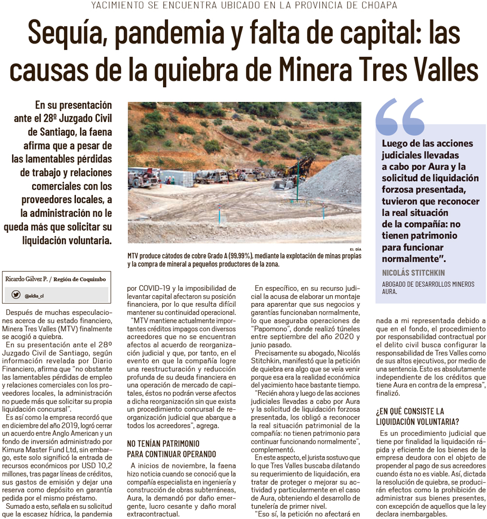 Acreedor de Minera Tres Valles: “Altos ejecutivos generaron un ardid para mostrar una realidad patrimonial distinta” - (Diario Financiero)