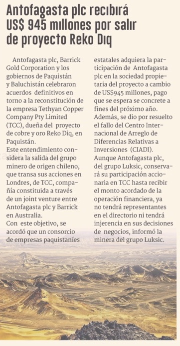 Minera del grupo Luksic acuerda su salida de millonario proyecto de cobre y oro en Pakistán - (Pulso)