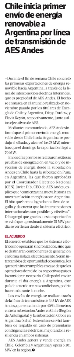 Chile inicia primer envía de energía renovable a Argentina a través de linea de transmisión de AES Andes - (El Longino Online)