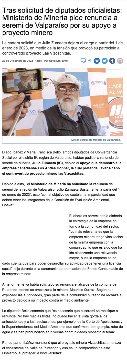 Gobierno pide renuncia de Seremi de Minería de Valparaíso tras críticas por apoyo a Vizcachitas - (biobiochile online)