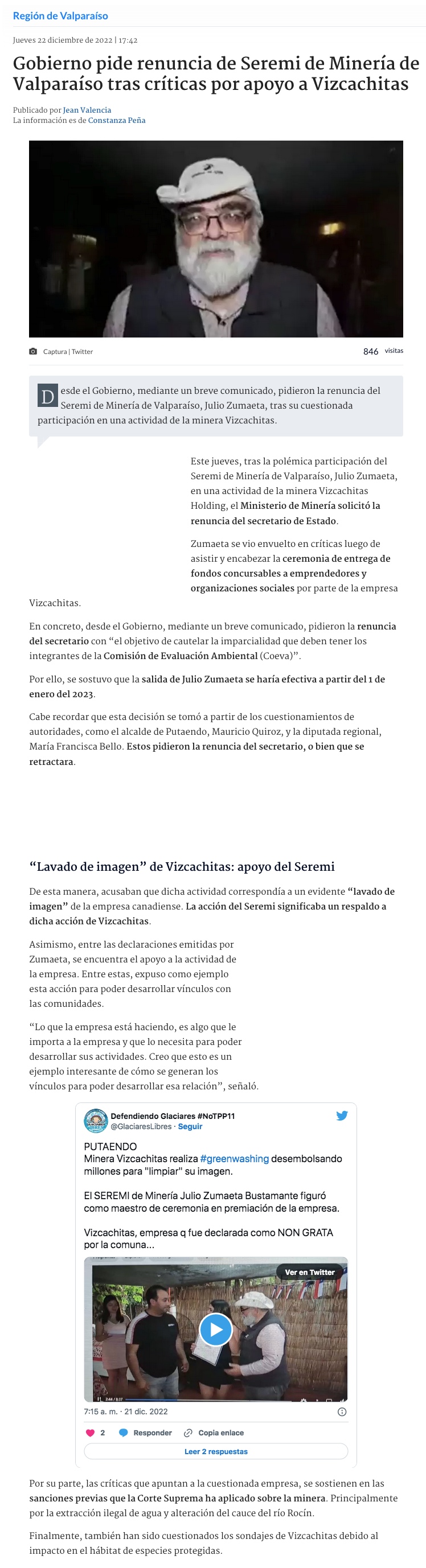 Tras solicitud de diputados oficialistas: Ministerio de Minería pide renuncia a seremi de Valparaíso por su apoyo a proyecto minero - (emol)