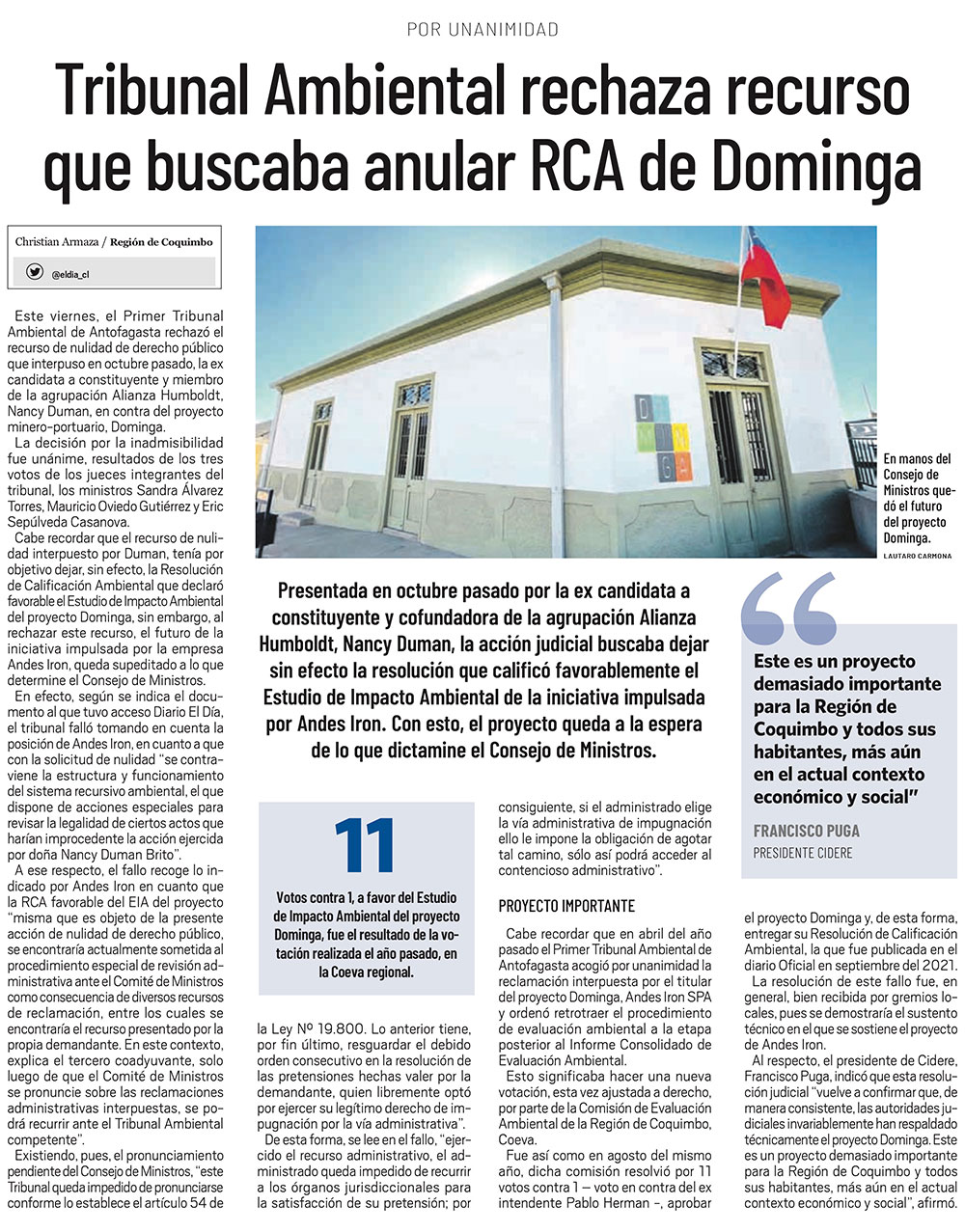 Minera Dominga: Tribunal Ambiental declara inadmisible recurso que pretendía anular RCA - (DF Online)