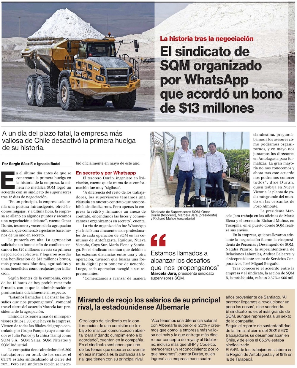 Supervisores de SQM cierran acuerdo que considera bono de término de $13 millones - (El Mercurio de Antofagasta)