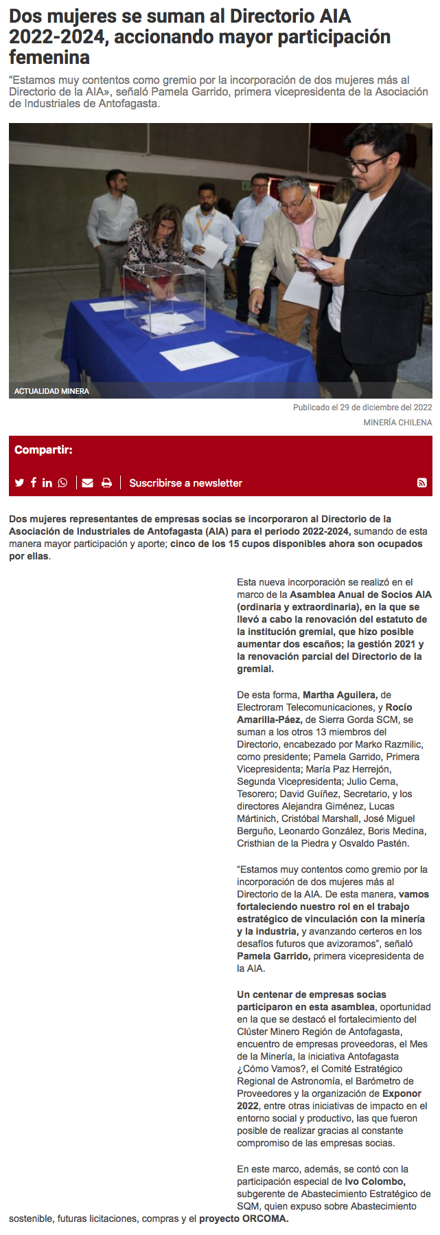 Dos mujeres se incorporan al directorio de AIA 2022-2024 - (El Mercurio de Antofagasta)