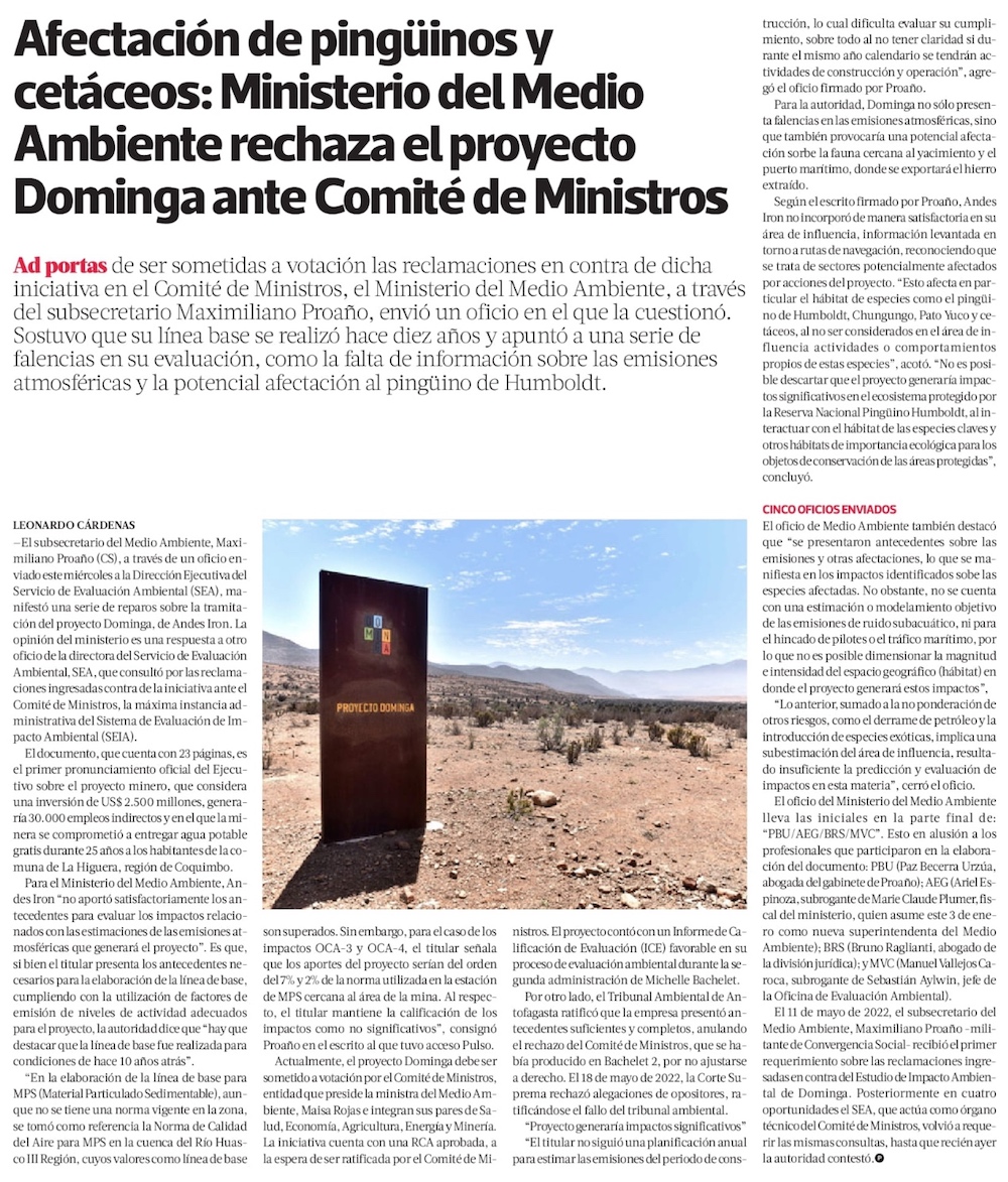Oficio del Ministerio del Medio Ambiente critica proyecto Dominga - (El Mercurio de Santiago)