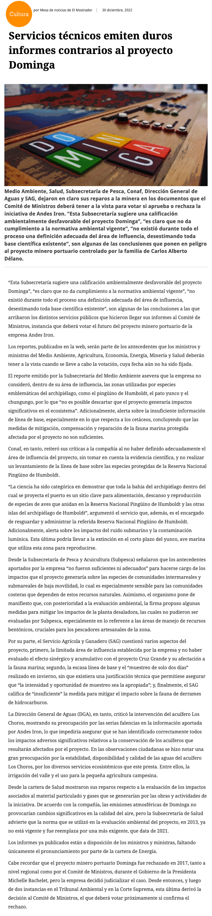 Oficio del Ministerio del Medio Ambiente critica proyecto Dominga - (El Mercurio de Santiago)
