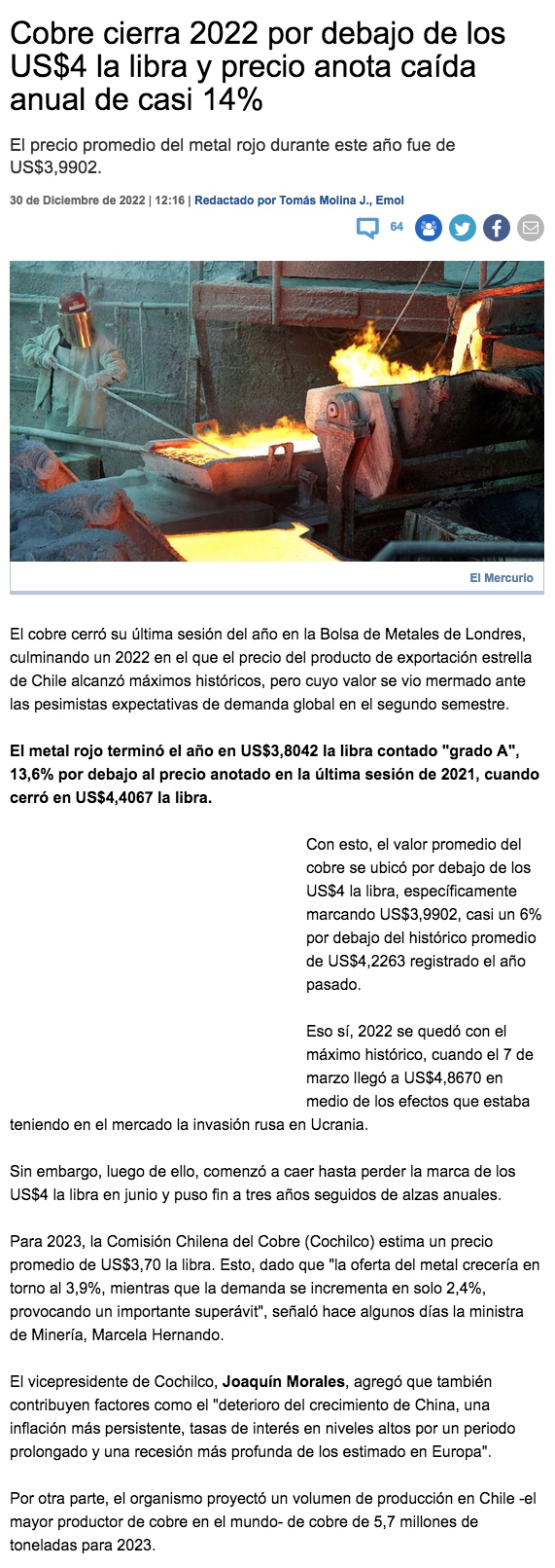Pese a caída anual de 13,4%, precio del cobre termina con su tercera mayor marca promedio en 2022 - (El Mercurio de Santiago)