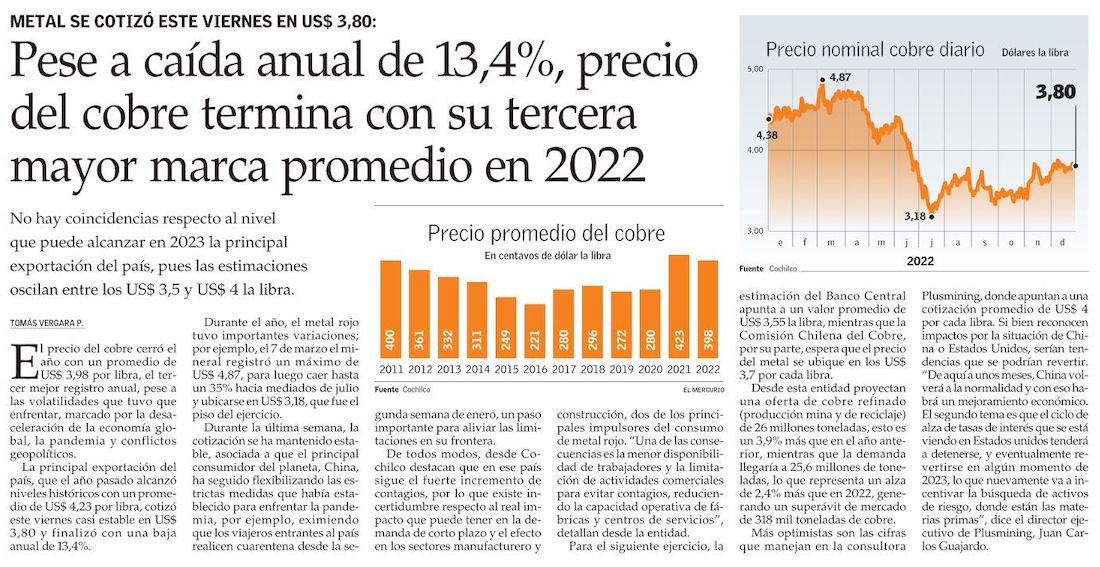 Cobre cierra 2022 por debajo de los US$4 la libra y precio anota caída anual de casi 14% - (emol)