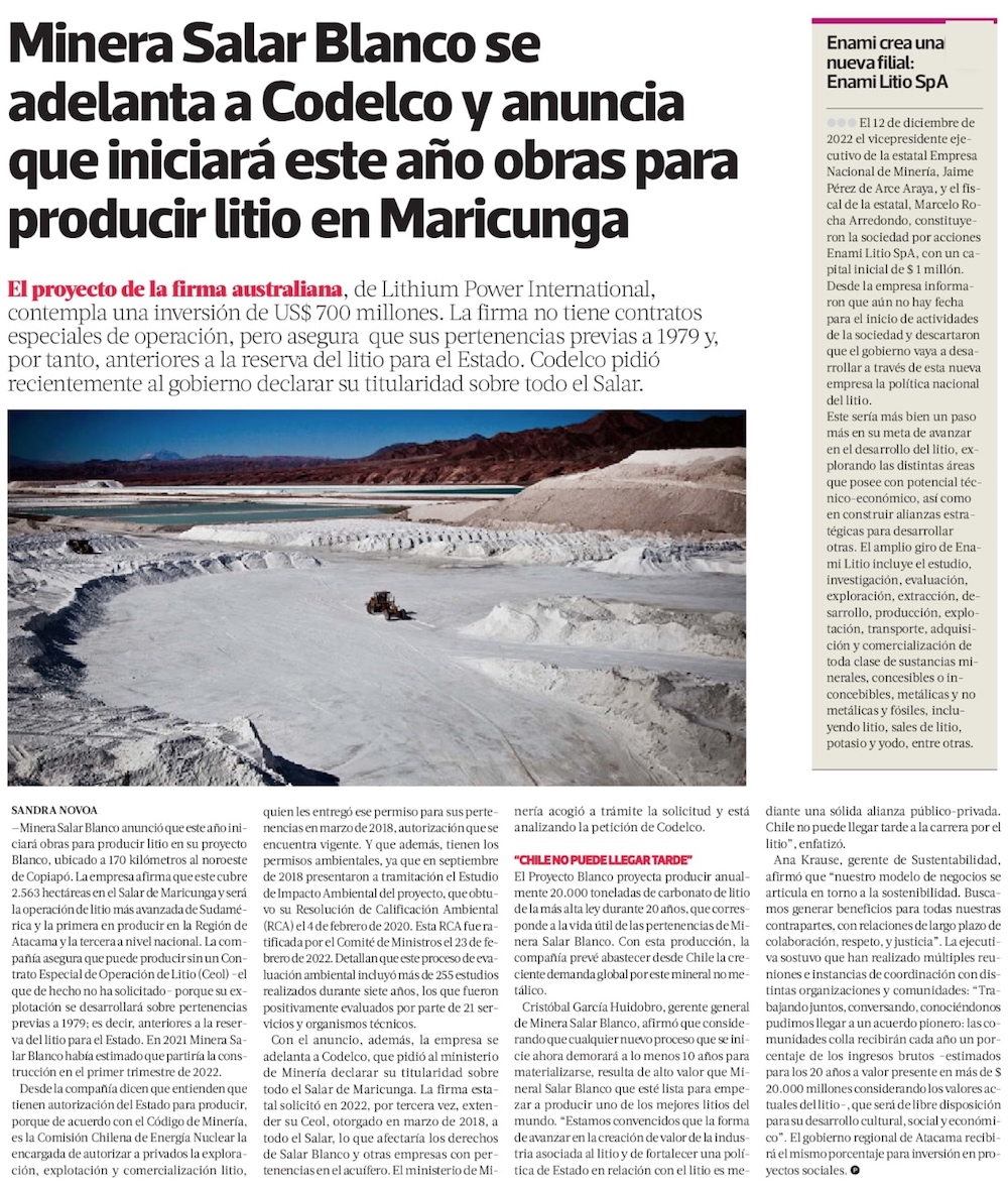 Minera Salar Blanco iniciará este año obras por unos US$ 700 millones para producir litio en la Región de Atacama - (El Mercurio de Santiago)