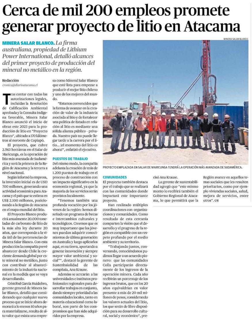Minera Salar Blanco iniciará este año obras por unos US$ 700 millones para producir litio en la Región de Atacama - (El Mercurio de Santiago)