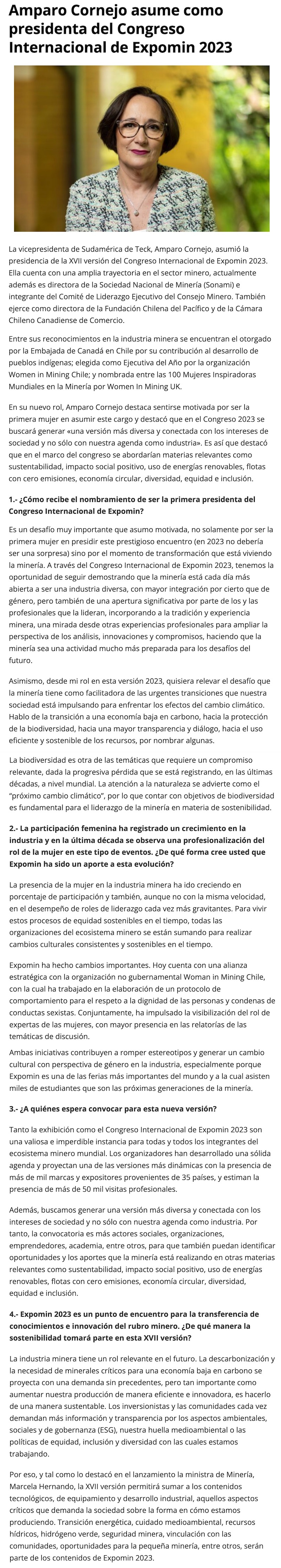 Amparo Cornejo asume como presidenta del Congreso Internacional de Expomin 2023 - (portalminero)
