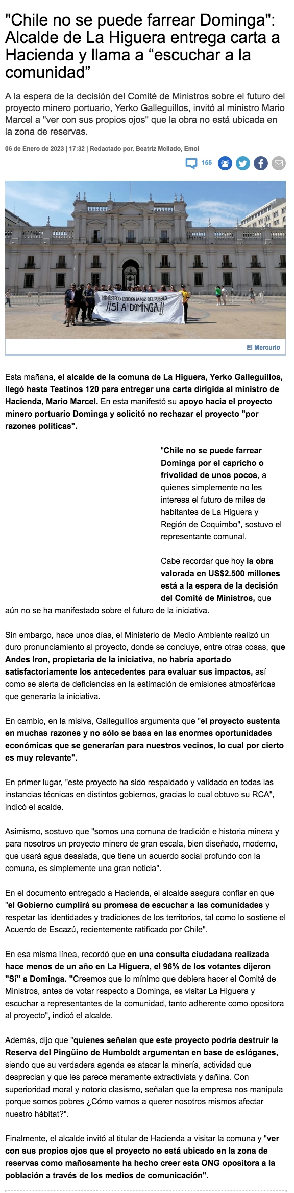 Vecinos y autoridades de La Higuera piden al Gobierno que apruebe el proyecto Dominga - (El Día)