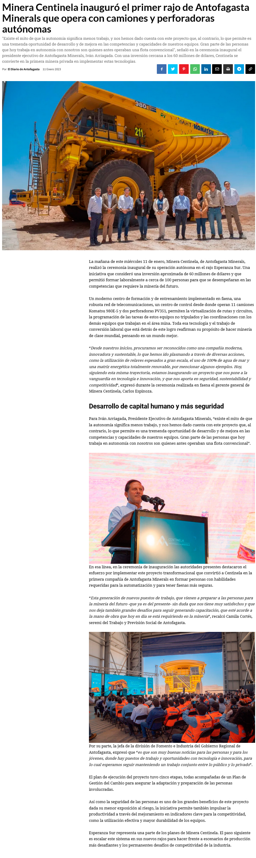Centinela es la primera minera privada en implementar camiones autónomos - (El Mercurio de Antofagasta)