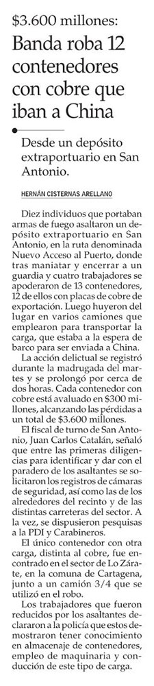Roban cargamento de cobre desde puerto de San Antonio equivalente a US$ 4,4 millones - (Diario Financiero)
