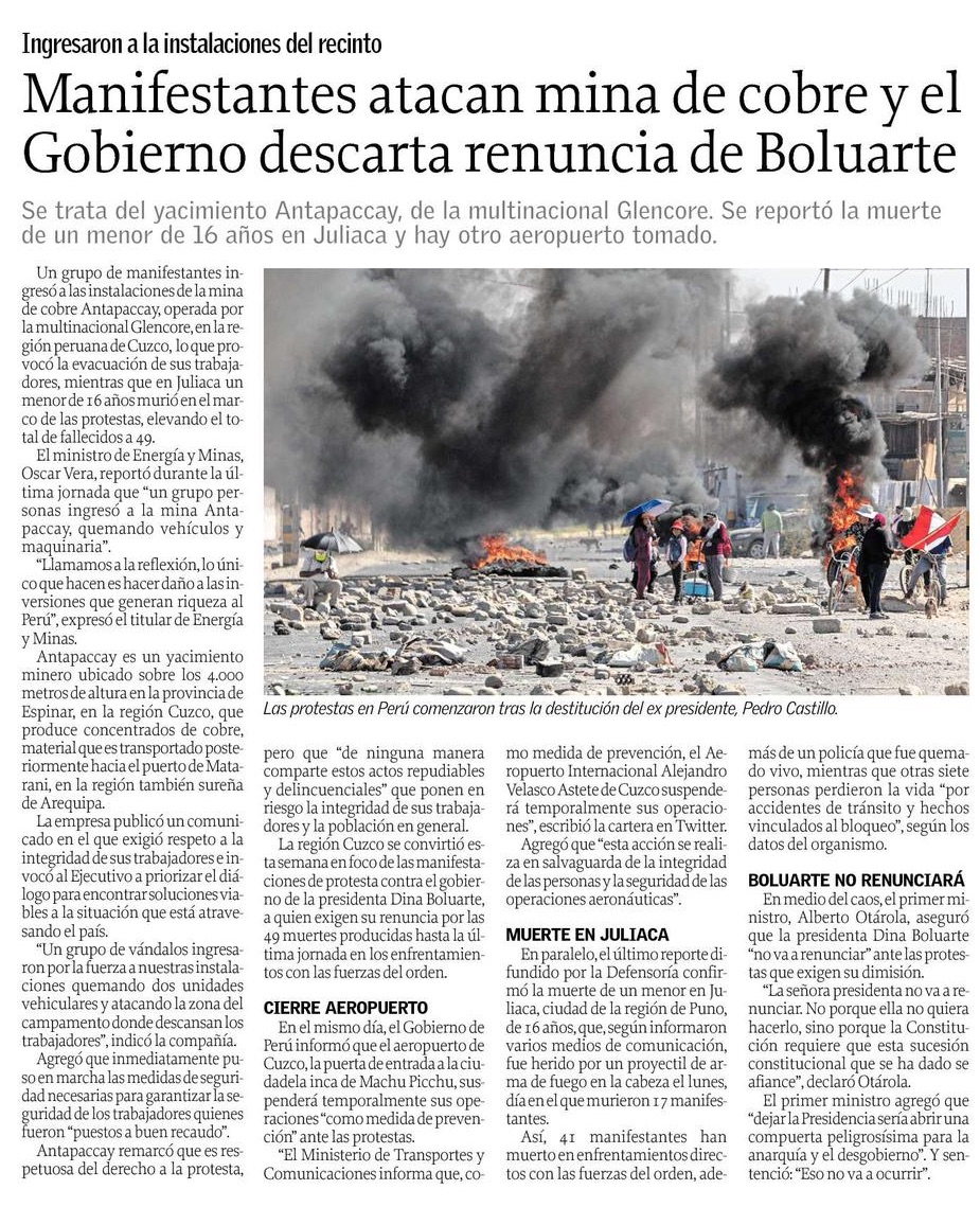 Protestas en Perú impiden a mineras de cobre Las Bambas, Hudbay y Antapaccay transportar su material - (dfsud.com)