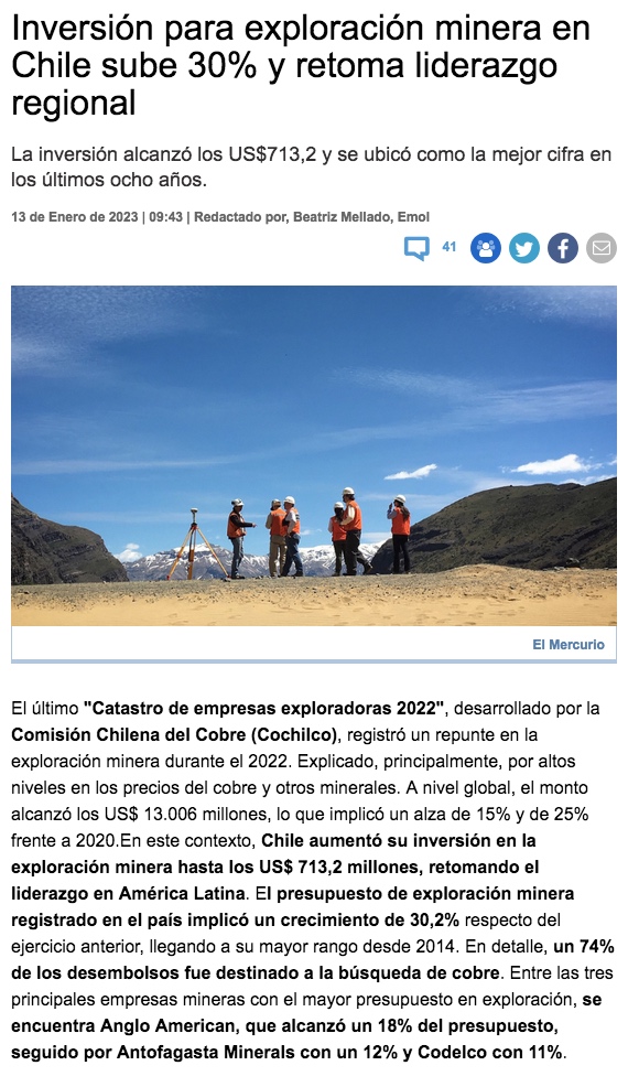 Presupuesto para exploración minera subió un 30%: Chile retoma dominio regional - (laNacion)