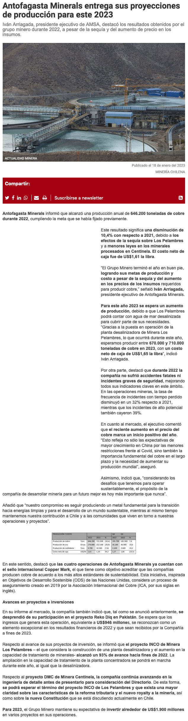 Antofagasta Minerals logró una producción de 646.200 toneladas de cobre fino en 2022 - (El Mercurio de Calama)