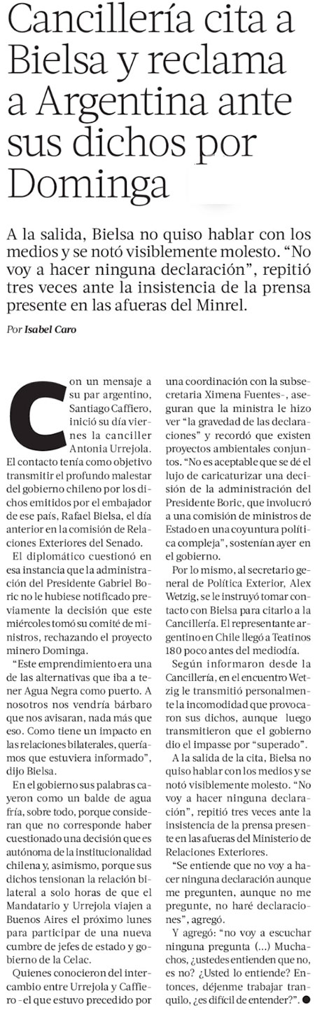 En antesala de viaje de Boric a Argentina, canciller cita a Bielsa por dichos sobre Dominga - (El Mercurio de Santiago)