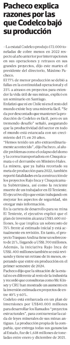 Codelco cifra en unos US$ 5.000 millones sobrecosto de proyectos estructurales - (El Mercurio de Santiago)