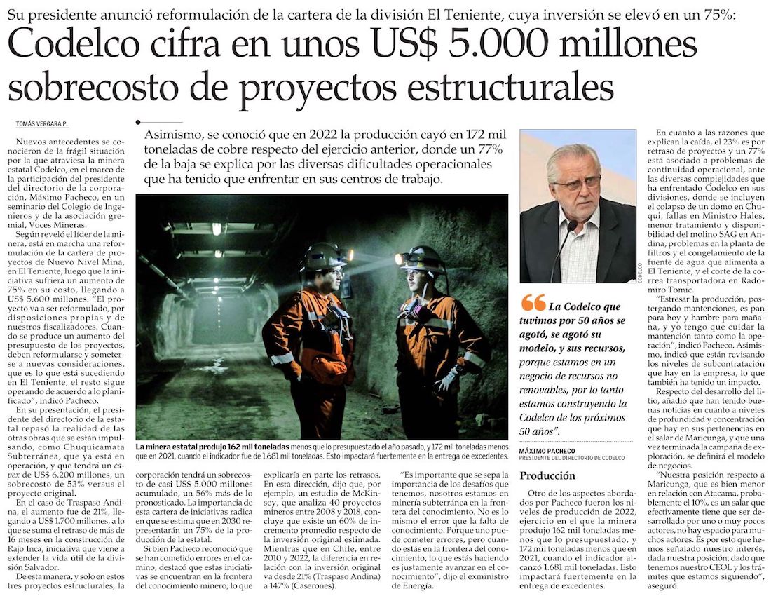 Pacheco revela sobrecostos de hasta 75% en proyectos de Codelco - (Diario Financiero)