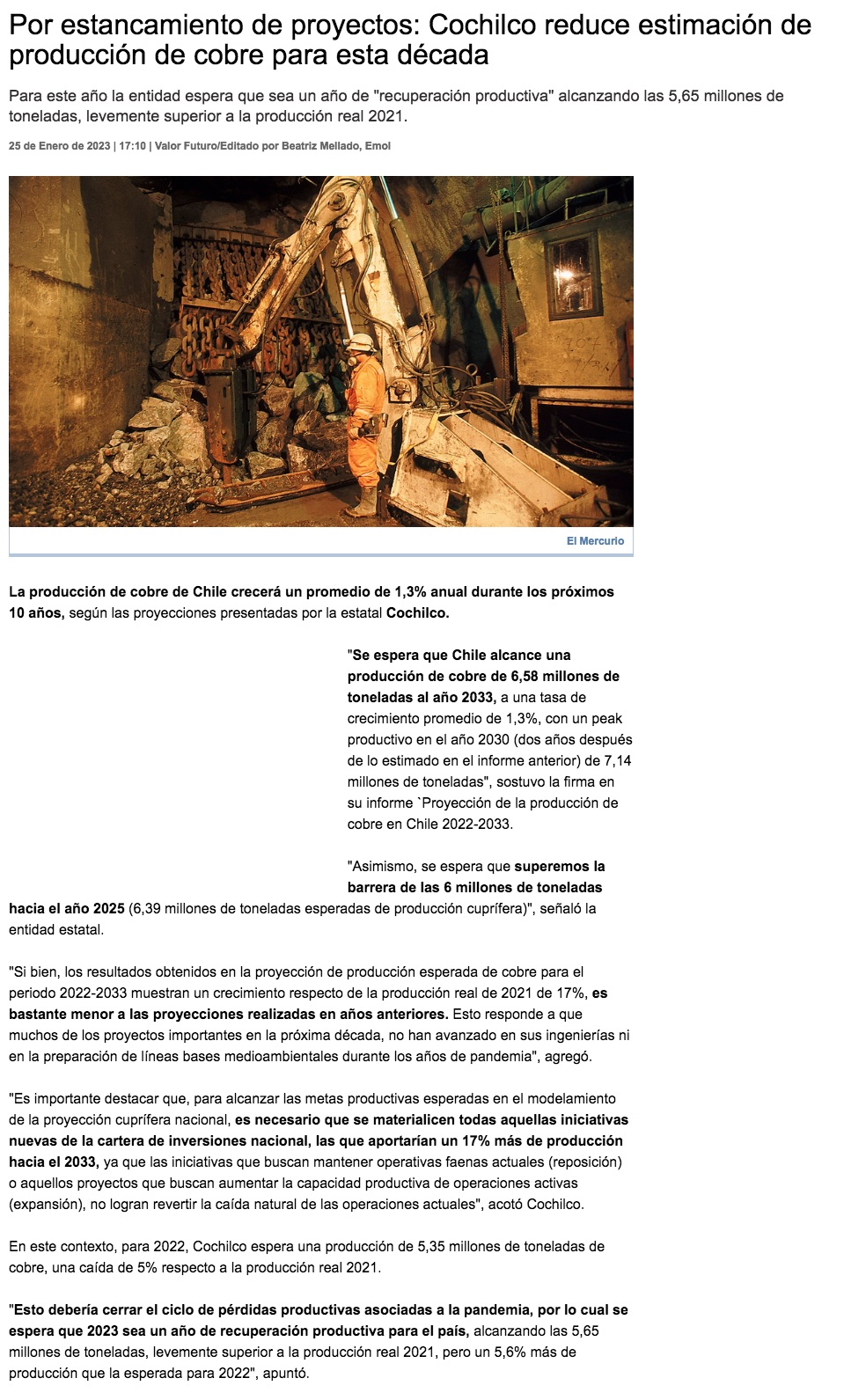 Cochilco ve una ralentización en la producción de cobre del país - (El Mercurio de Santiago)