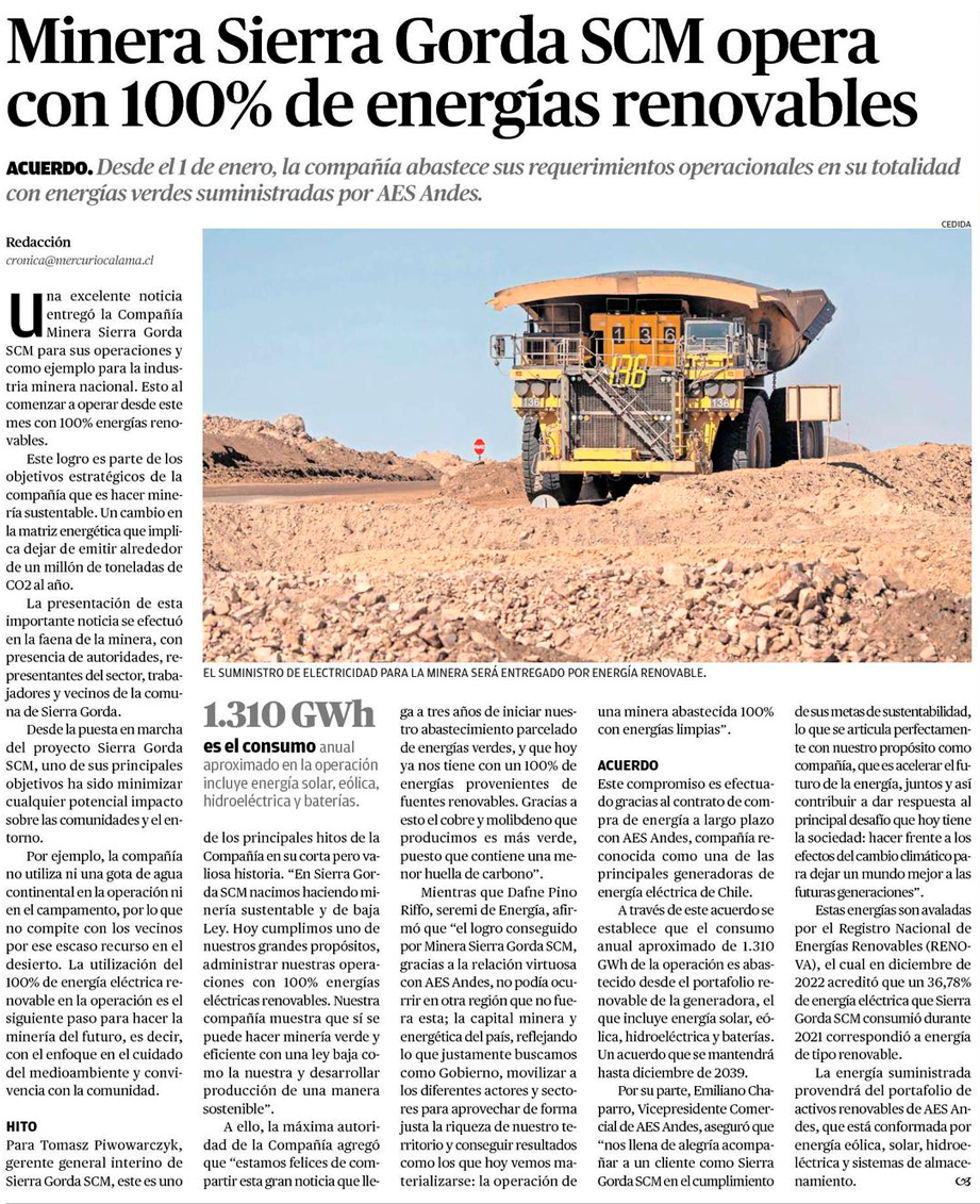 Minera Sierra Gorda anuncia operaciones con 100% de energías renovables - (norteminero online)
