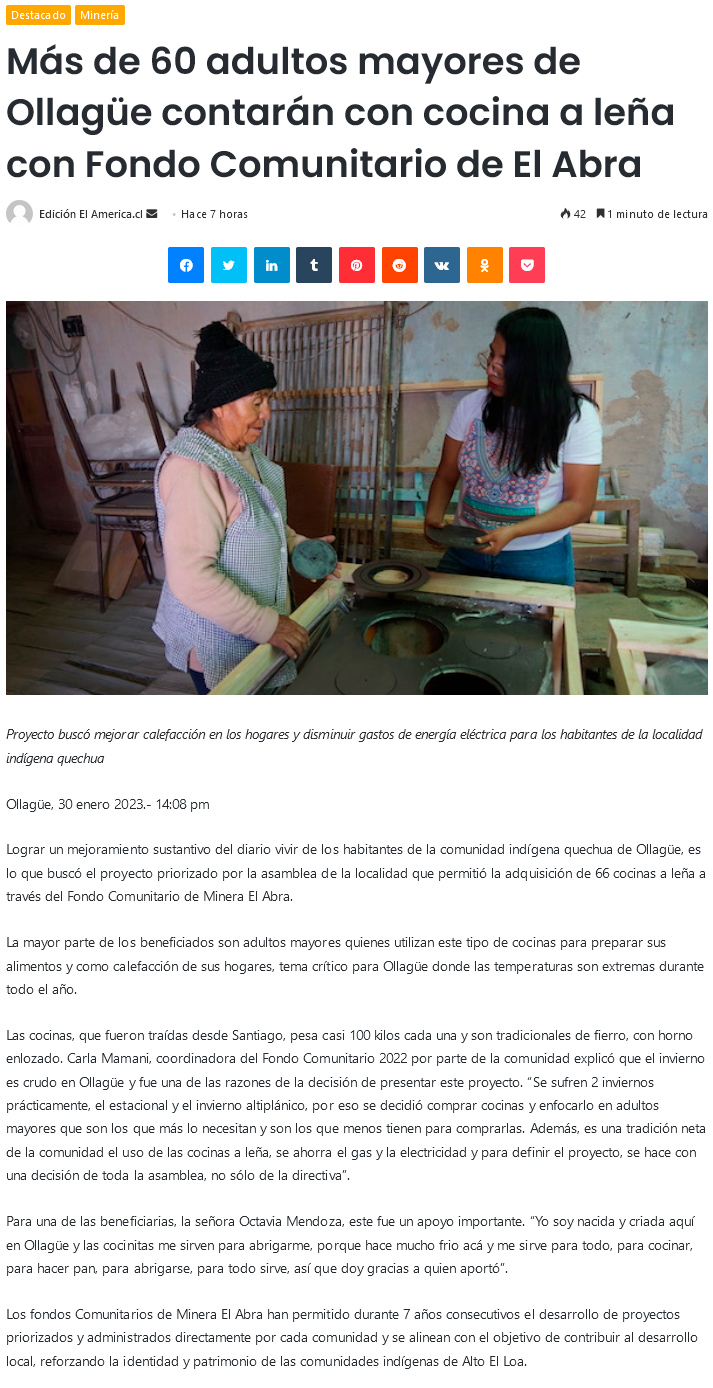66 adultos mayores de Ollagüe contarán con concina a leña - (El Mercurio de Antofagasta)