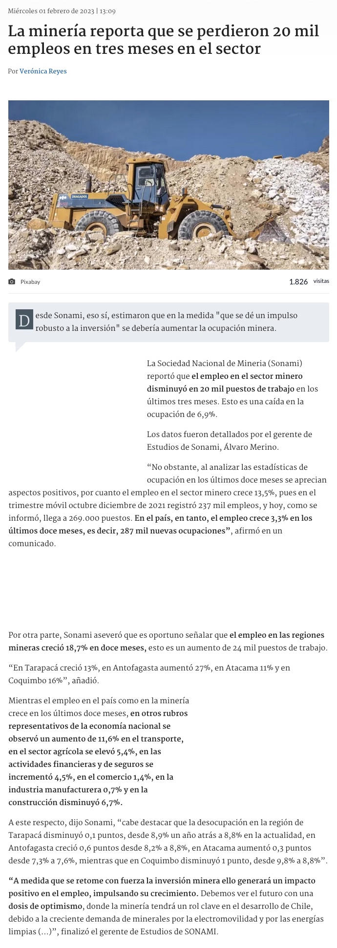 Minería perdió 20 mil empleos en tres meses - (El Diario de Atacama)