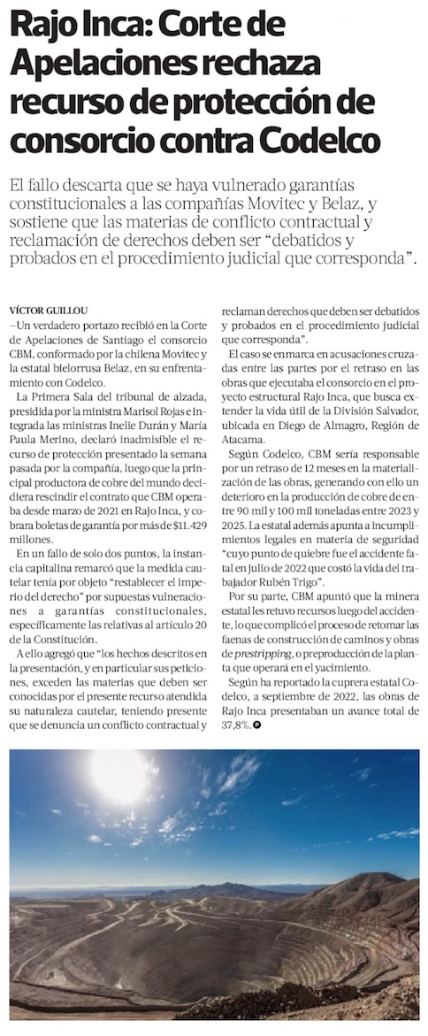 Corte de Apelaciones declara inadmisible recurso de protección de CBM contra Codelco - (El Mercurio de Santiago)