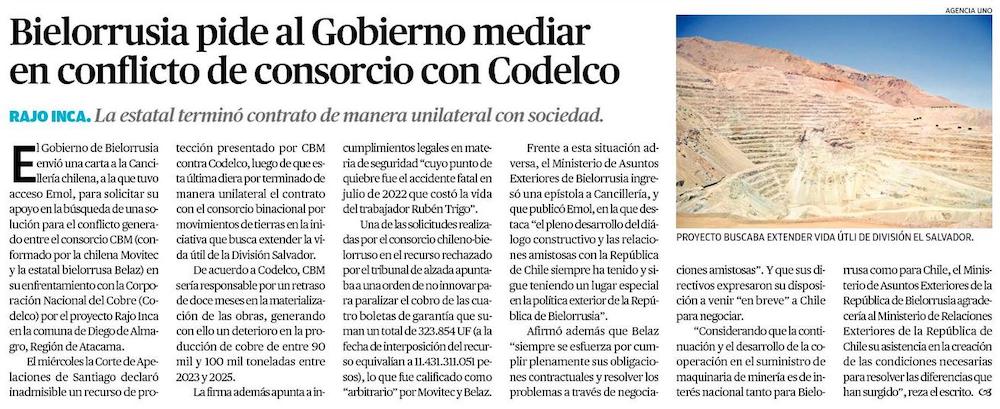 CBM busca acuerdo con Codelco y Bielorrusia pide intervención de la Cancillería en conflicto - (El Mercurio de Santiago)