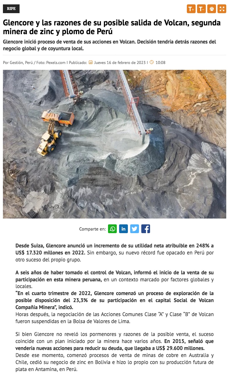 Glencore sale de mina peruana por coyuntura local y externa - (La Segunda)