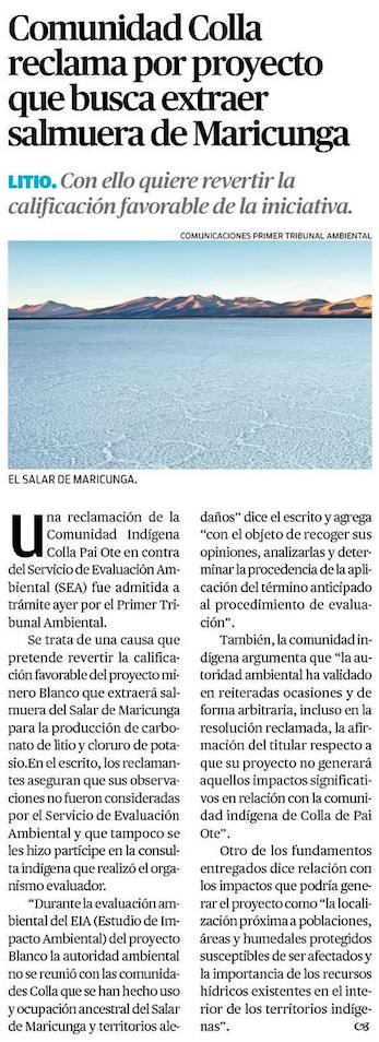 Presentan reclamación por proyecto de litio en Maricunga - (El Mercurio de Santiago)