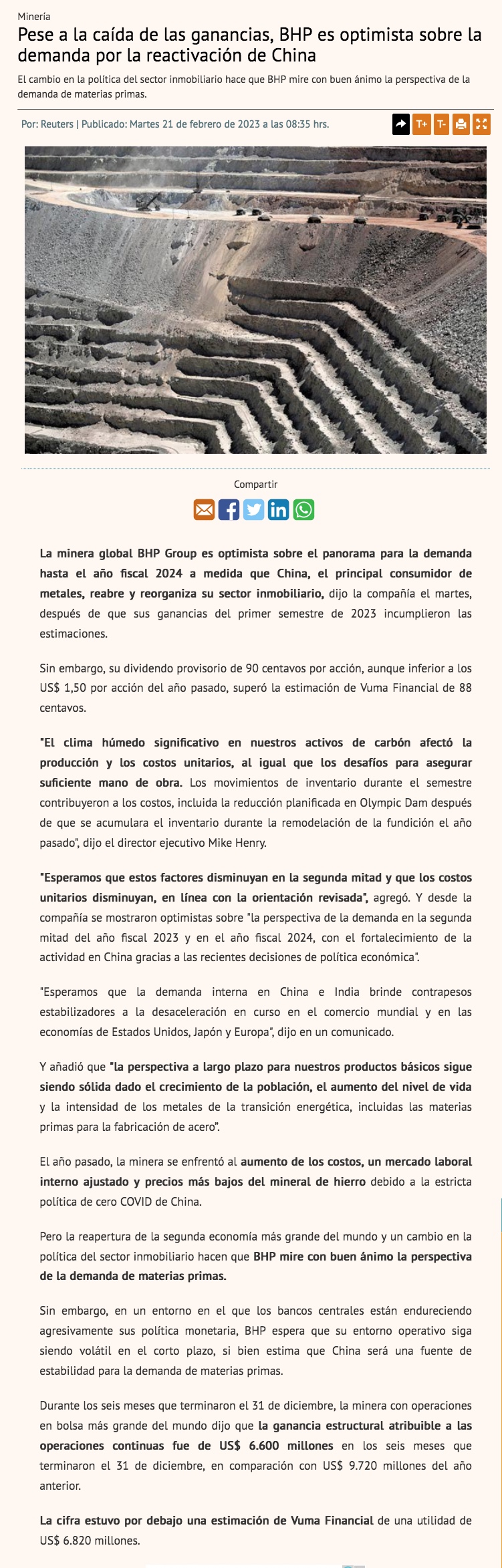 Pese a caída en ganancias, BHP es optimista por reactivación de China - (Diario Financiero)