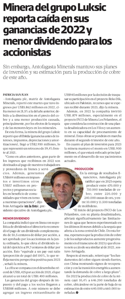 Antofagasta Minerals generó impuestos por US$ 604 millones durante el 2022 - (El Mercurio de Antofagasta)