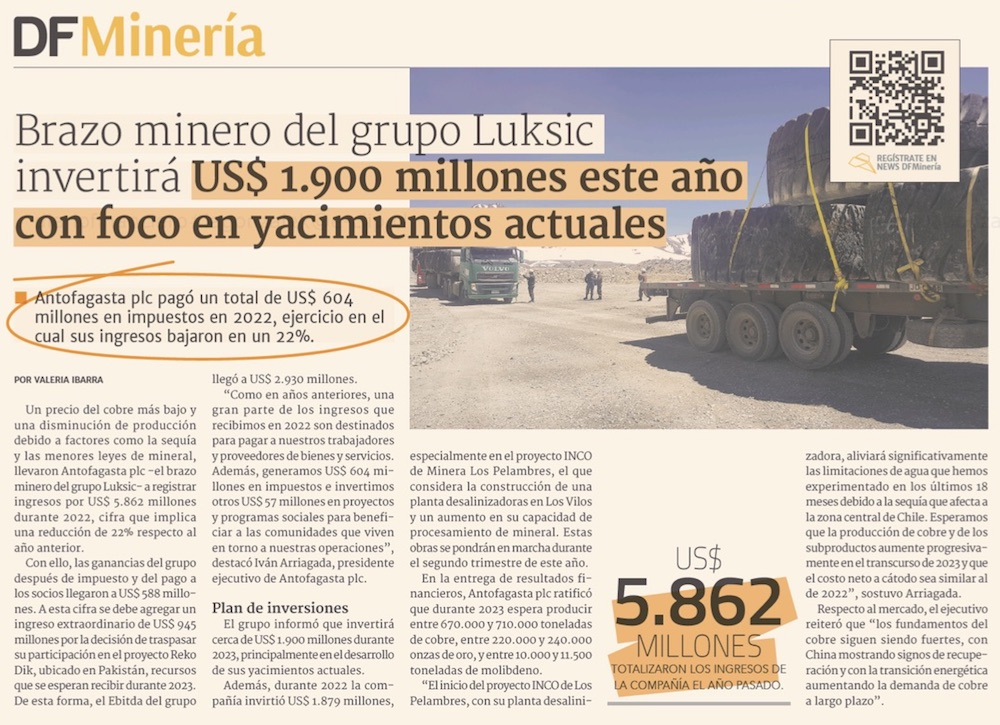 Antofagasta Minerals generó impuestos por US$ 604 millones durante el 2022 - (El Mercurio de Antofagasta)