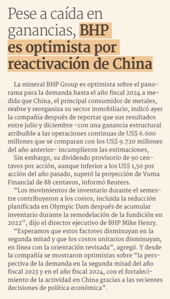 Pese a la caída de las ganancias, BHP es optimista sobre la demanda por la reactivación de China - (DF Online)