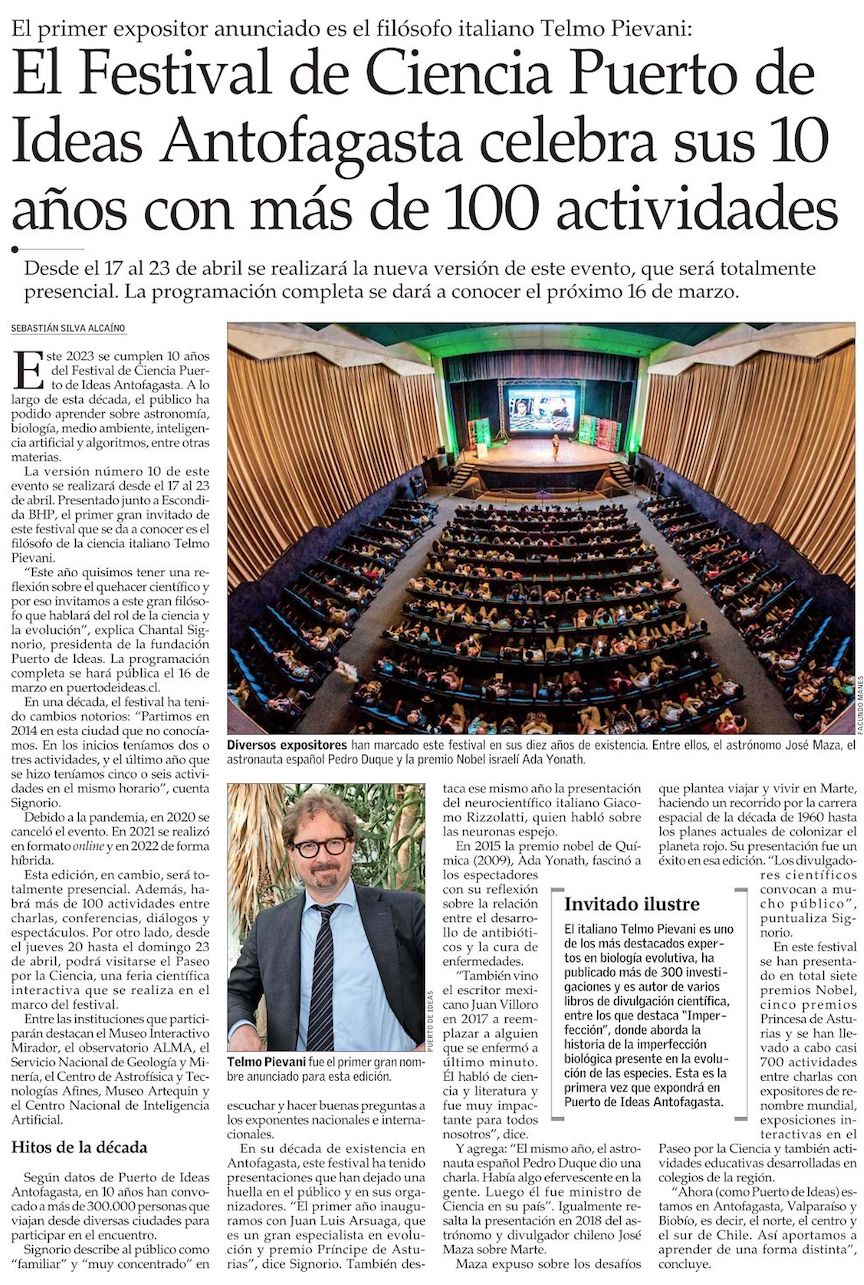 Festival de Ciencia Puerto de Ideas Antofagasta celebra 10 años con invitados imperdibles y una gran feria científica - (El Mercurio de Antofagasta)