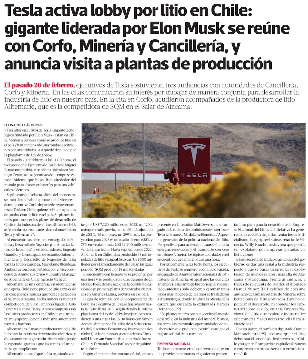 Tesla despliega lobby con el gobierno y busca opciones de colaboración en Chile - (El Mercurio de Santiago)