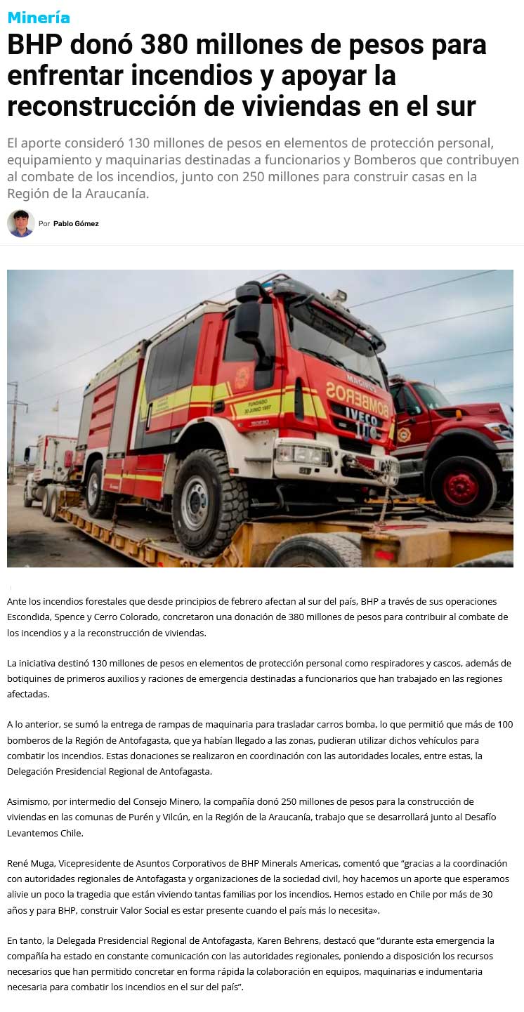 BHP donó 380 millones de pesos para enfrentar incendios y apoyar la reconstrucción de viviendas en el sur - (coweb.cl)