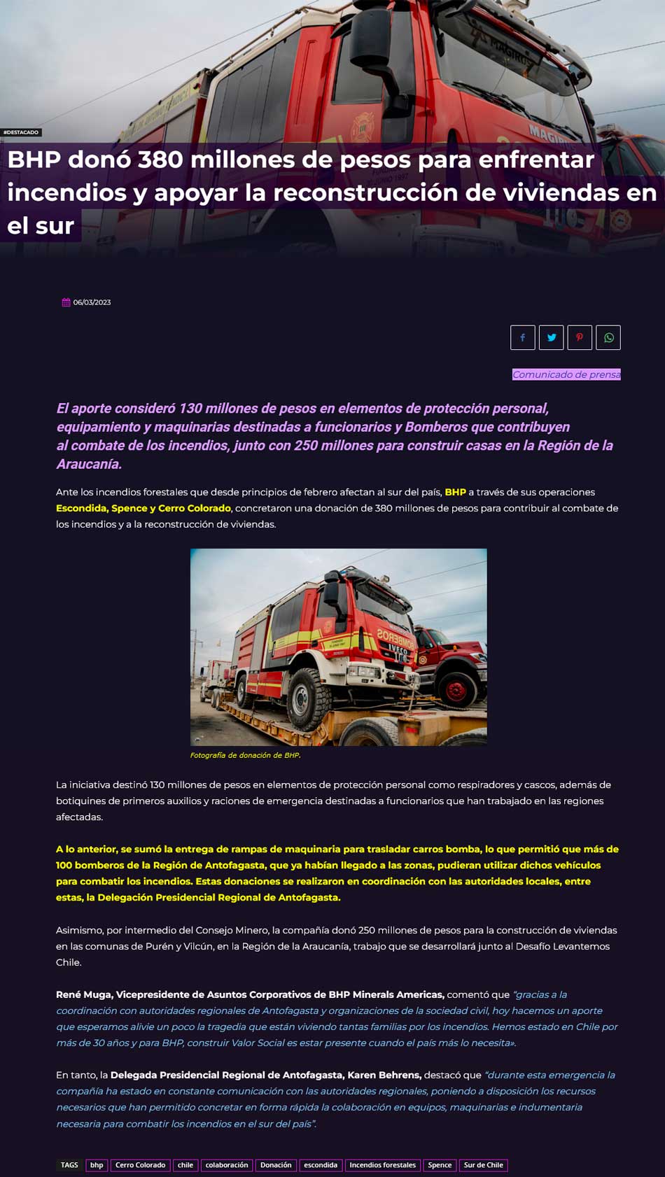 BHP donó 380 millones de pesos para enfrentar incendios y apoyar la reconstrucción de viviendas en el sur - (diarioangamos)