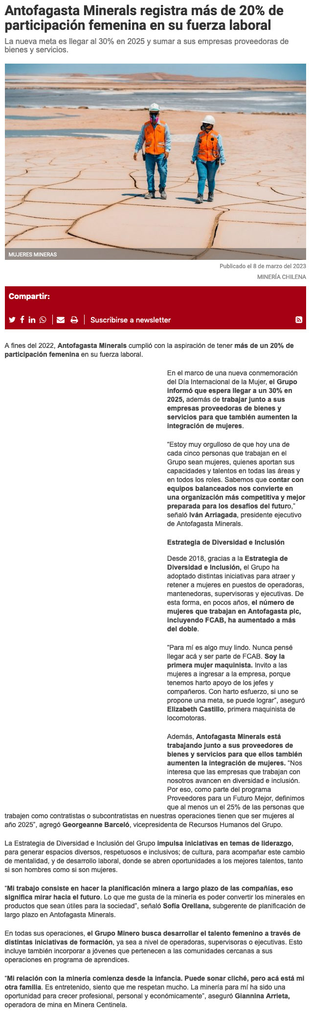 Mujeres en minería: Antofagasta Minerals proyecta llegar a un 30% de dotación femenina en 2025 - (diarioantofagasta)