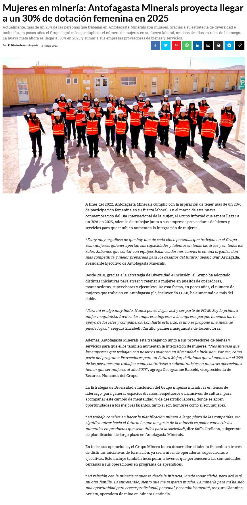 Antofagasta Minerals registra más de 20% de participación femenina en su fuerza laboral - (mch.cl)